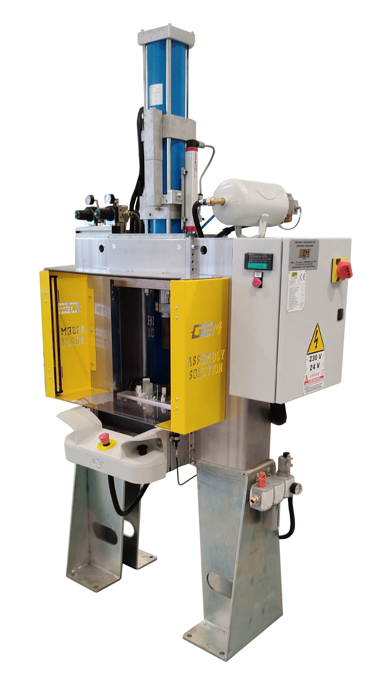 Pressa a collo di cigno per la clinciatura di dadi/viti alimentati automaticamente.